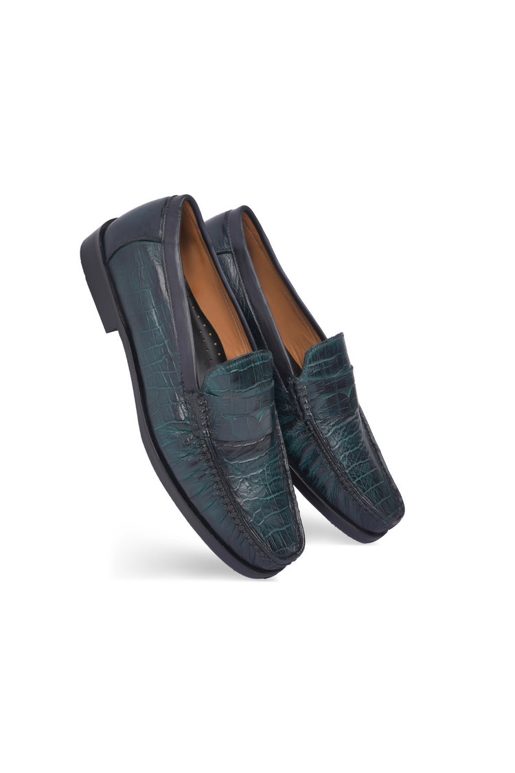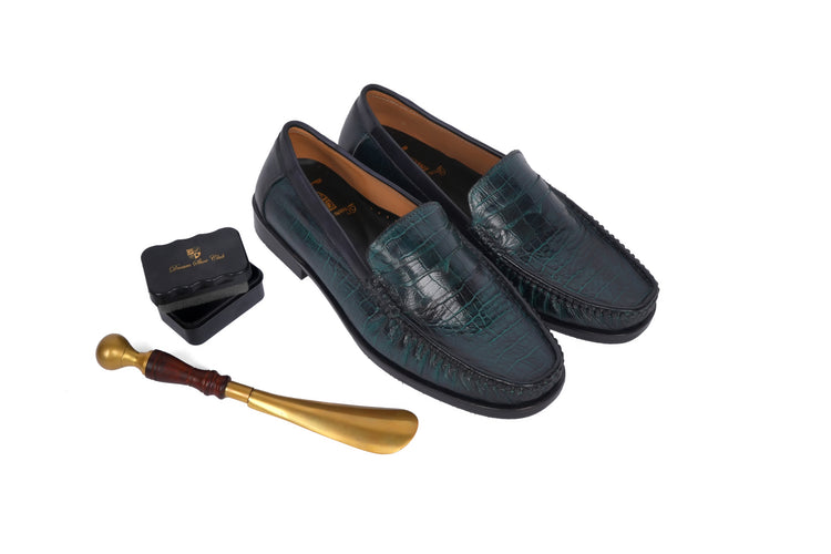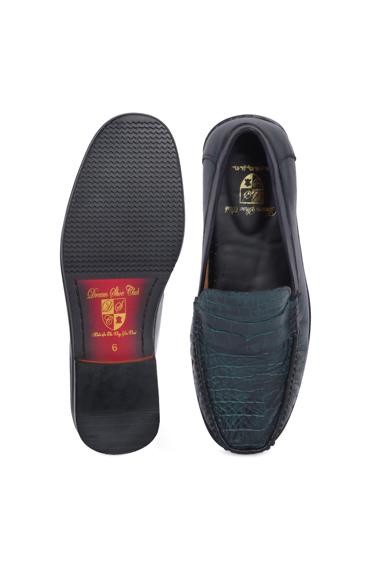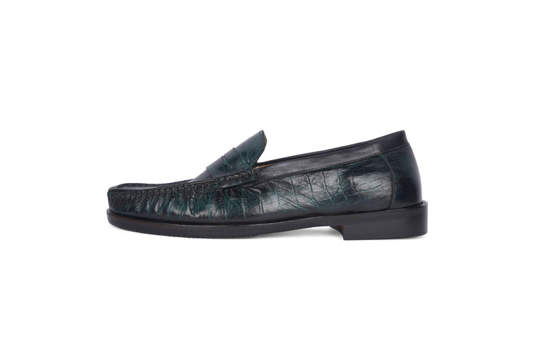 Hand-finished in green and black patina crocodile leather, featuring a classic penny strap and squared-off silhouette. Lightweight, flexible, and built on a driver sole — comfort meets exotic craftsmanship.